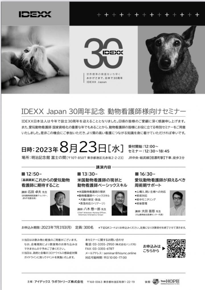 8/23 【IDEXX Japan 30周年記念 動物看護師様向けセミナー】で司会を務めます
